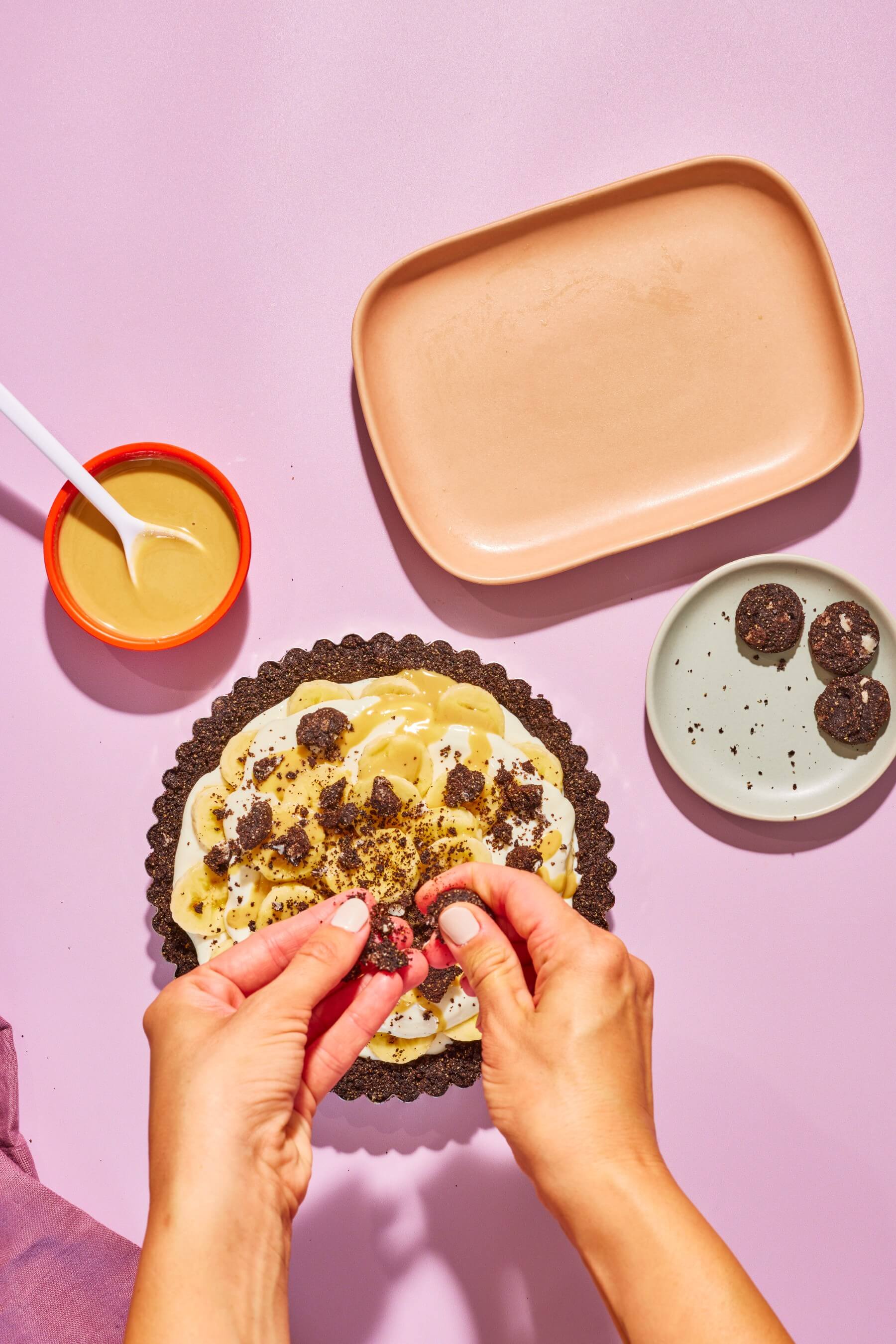 - Pile the remaining banana slices on top, drizzle with tahini and crush the remaining Myna cookies over everything.