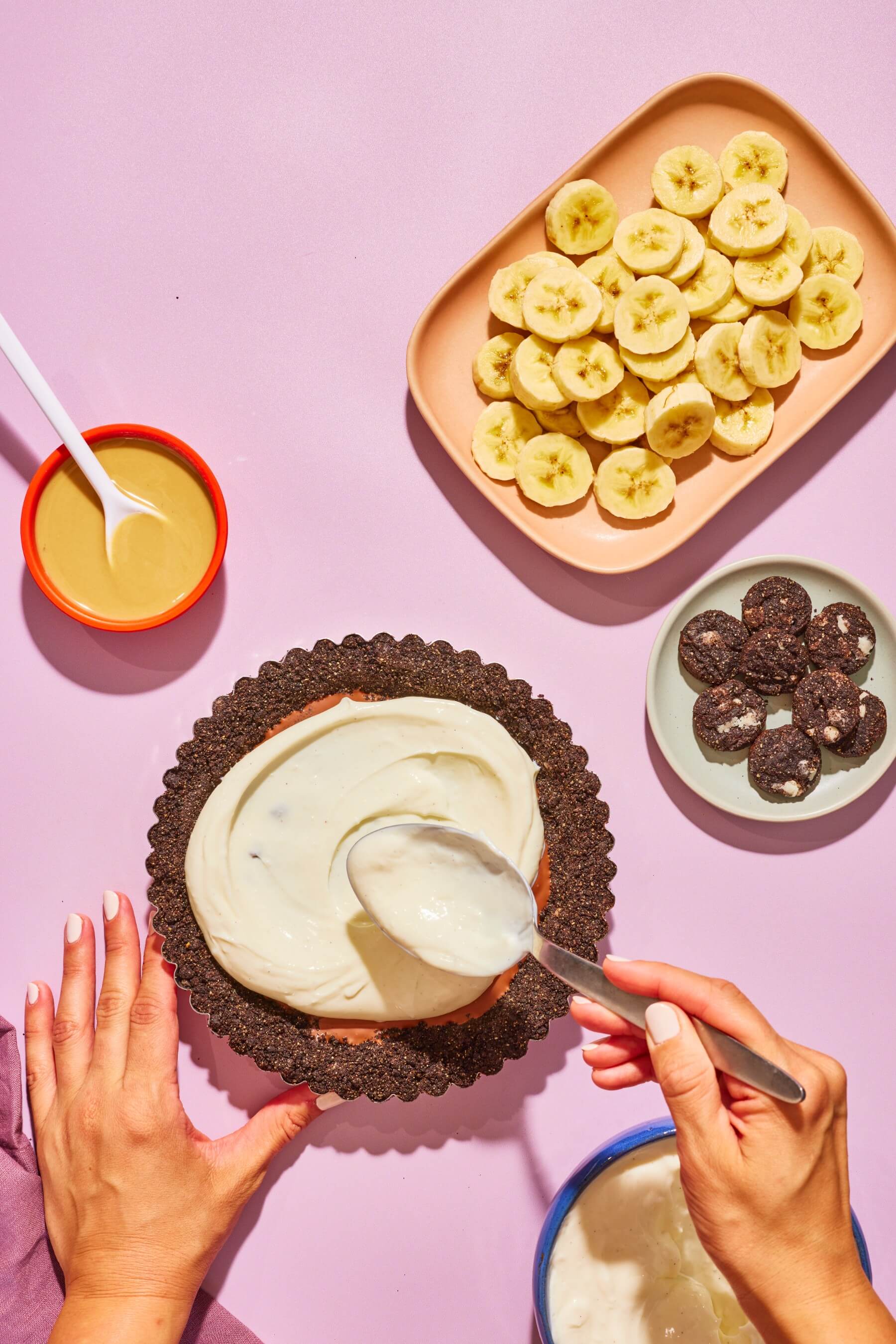 - When ready to serve, fill the pie crust with 1 cup of vanilla yogurt and spread to the edges. Evenly distribute half of the banana slices over top of the yogurt. Spread another cup of yogurt over the bananas.