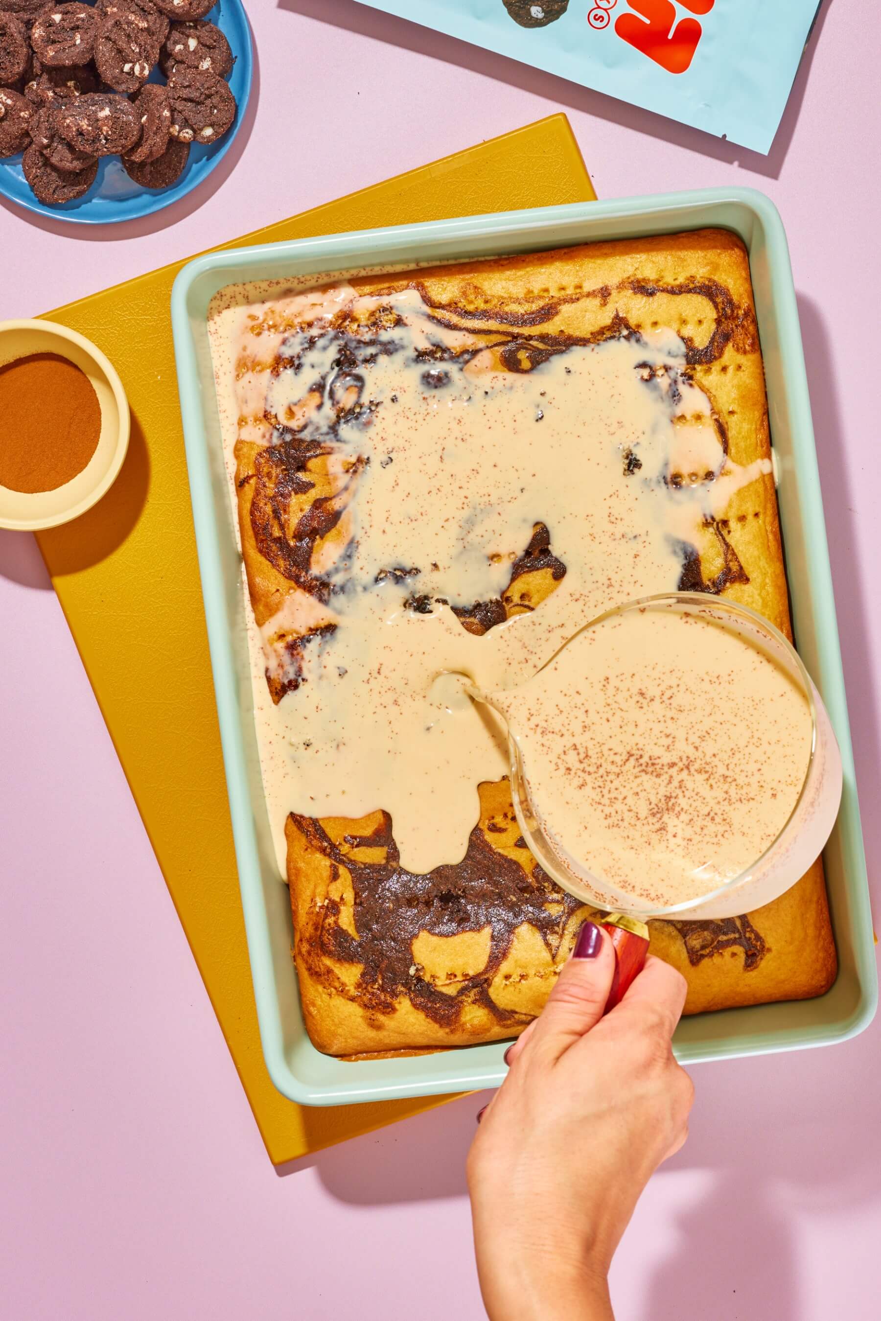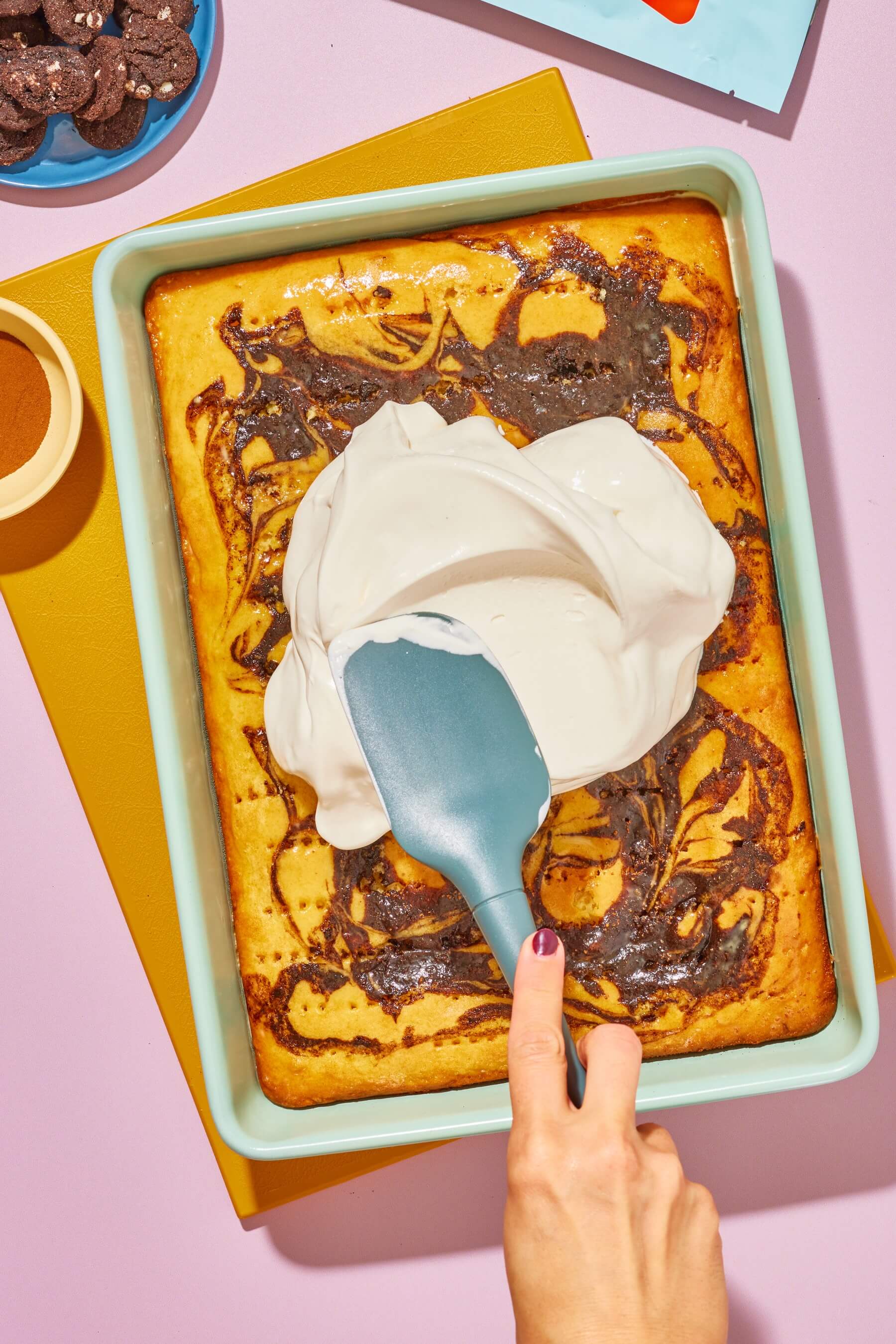 - Top cake with thawed frozen whipped topping and garnish with remaining ground cinnamon and crushed Myna Midnight Mini Cookies.