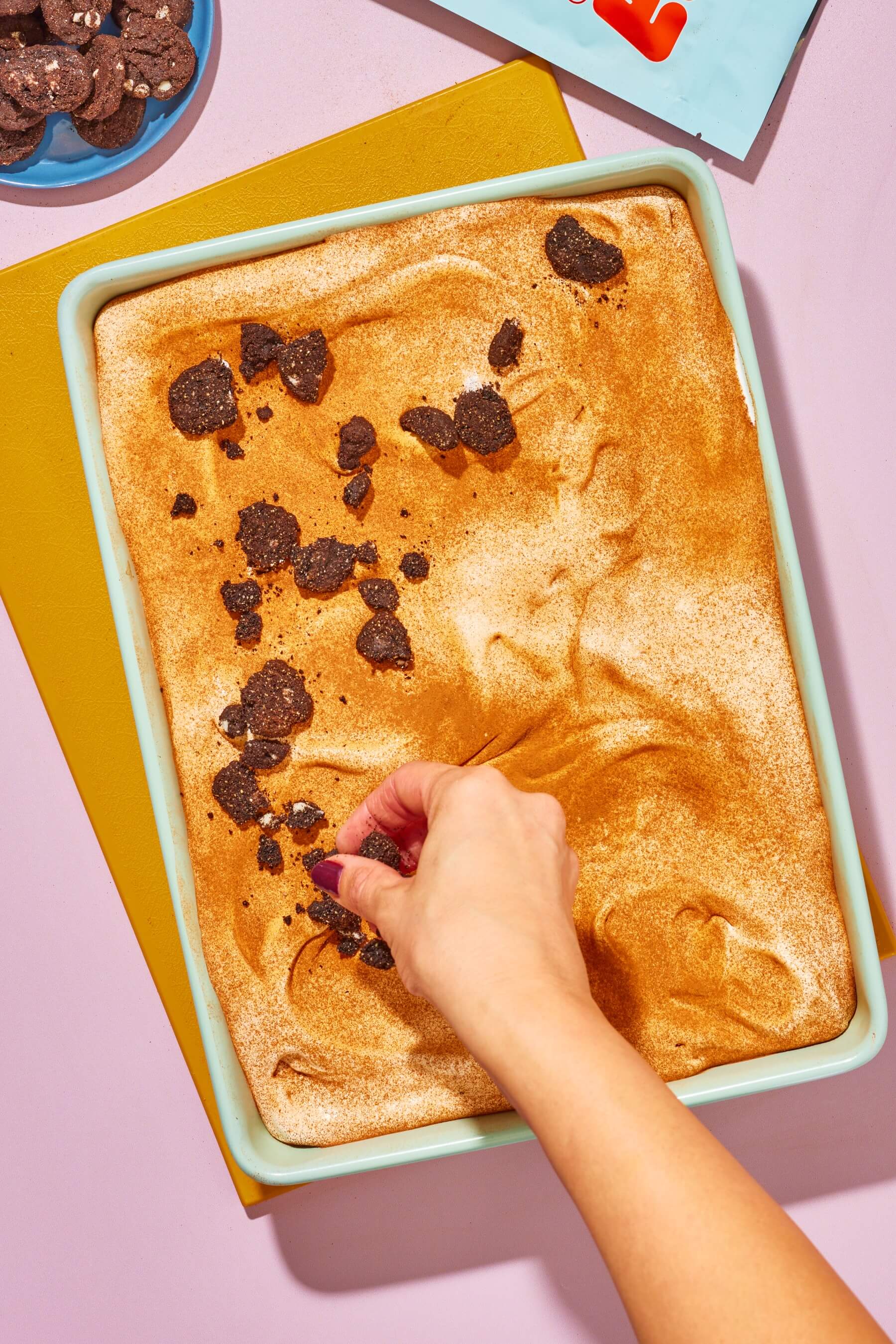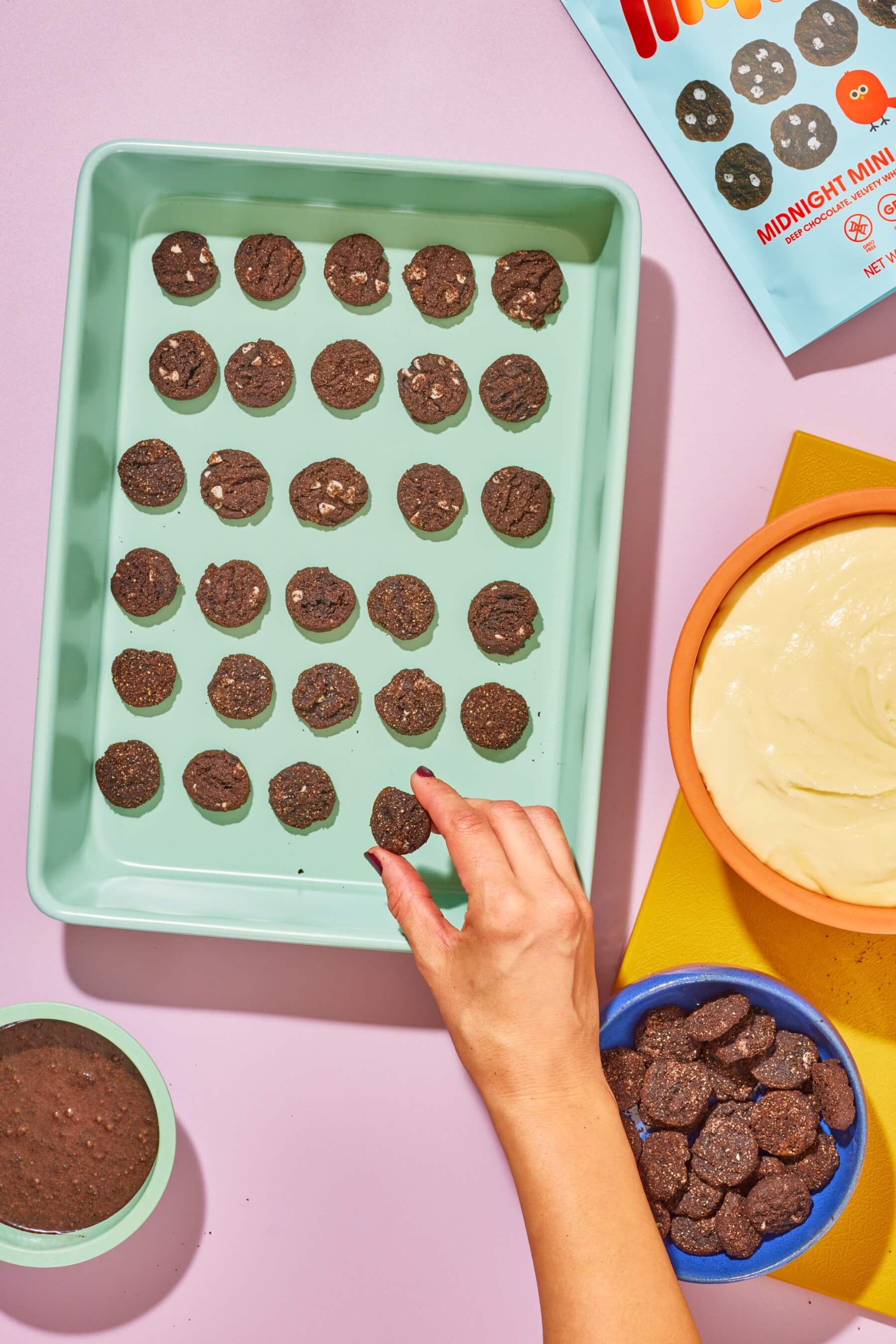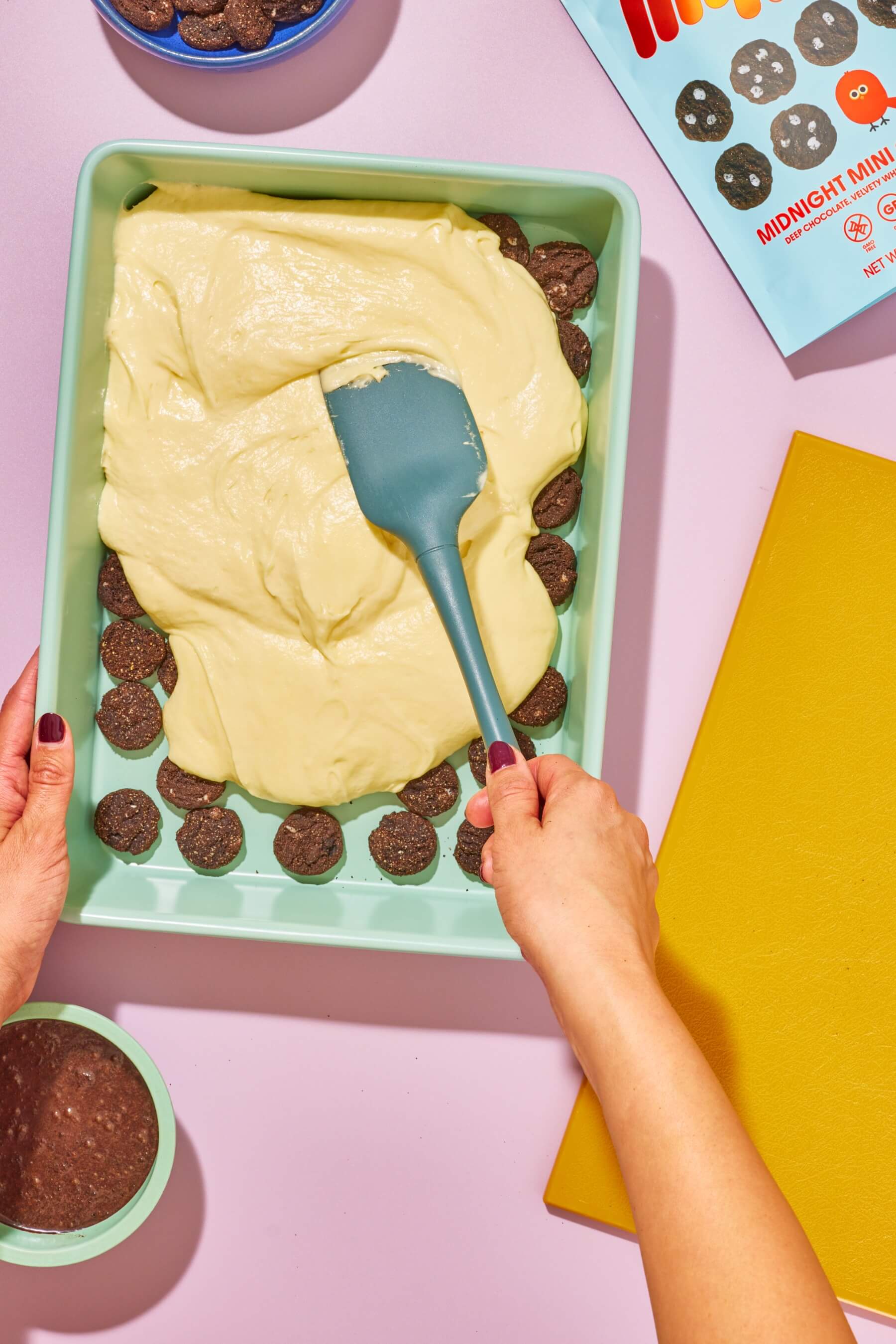 - Preheat the oven to boxed cake mix instructions and prepare a 9x13 cake pan by spraying it with cooking spray. Line the cake pan with 8 ounces (2 packages) of whole Myna Midnight Mini Cookies.