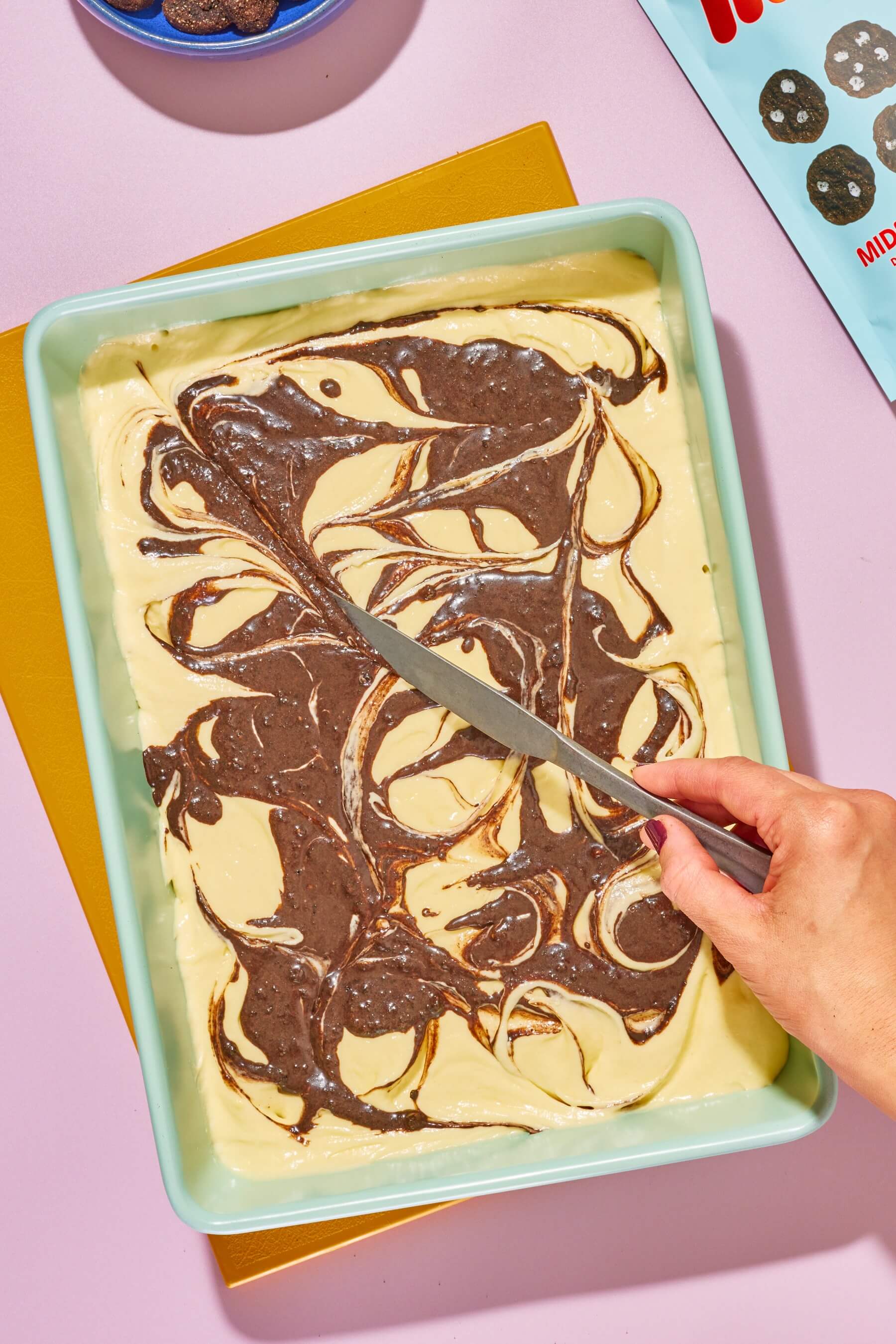 - Dollop the Midnight Myna cookie batter over the gluten free cake batter about 3 inches apart. Use a knife or skewer to swirl around each dollop into the batter and make a marbled design. Bake the cake to package instructions, about 30 minutes.