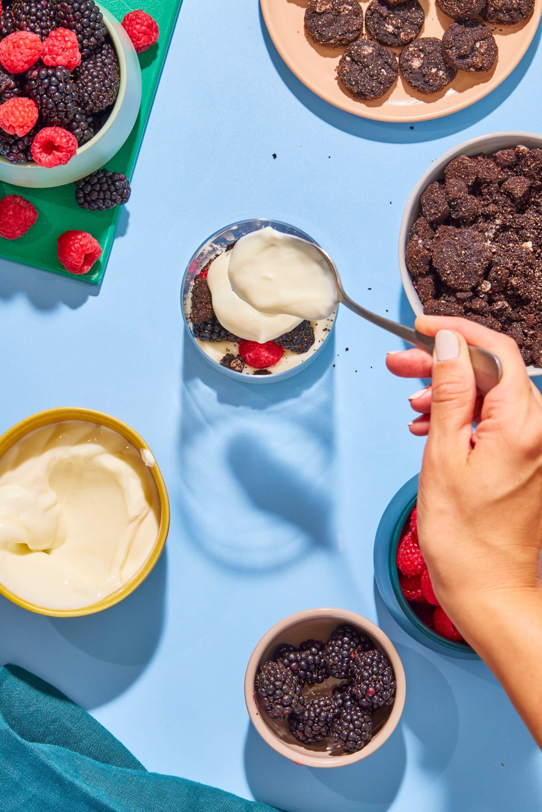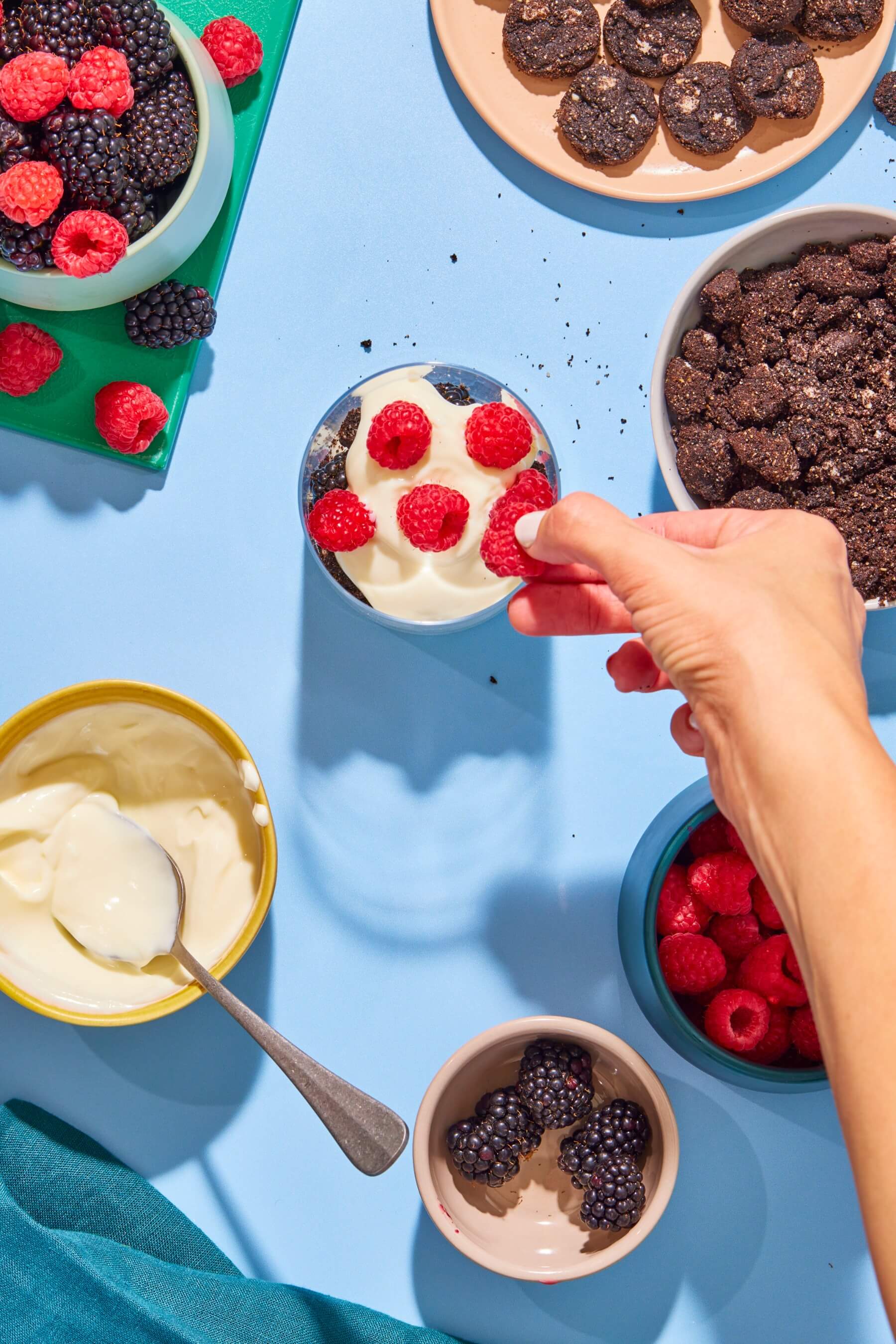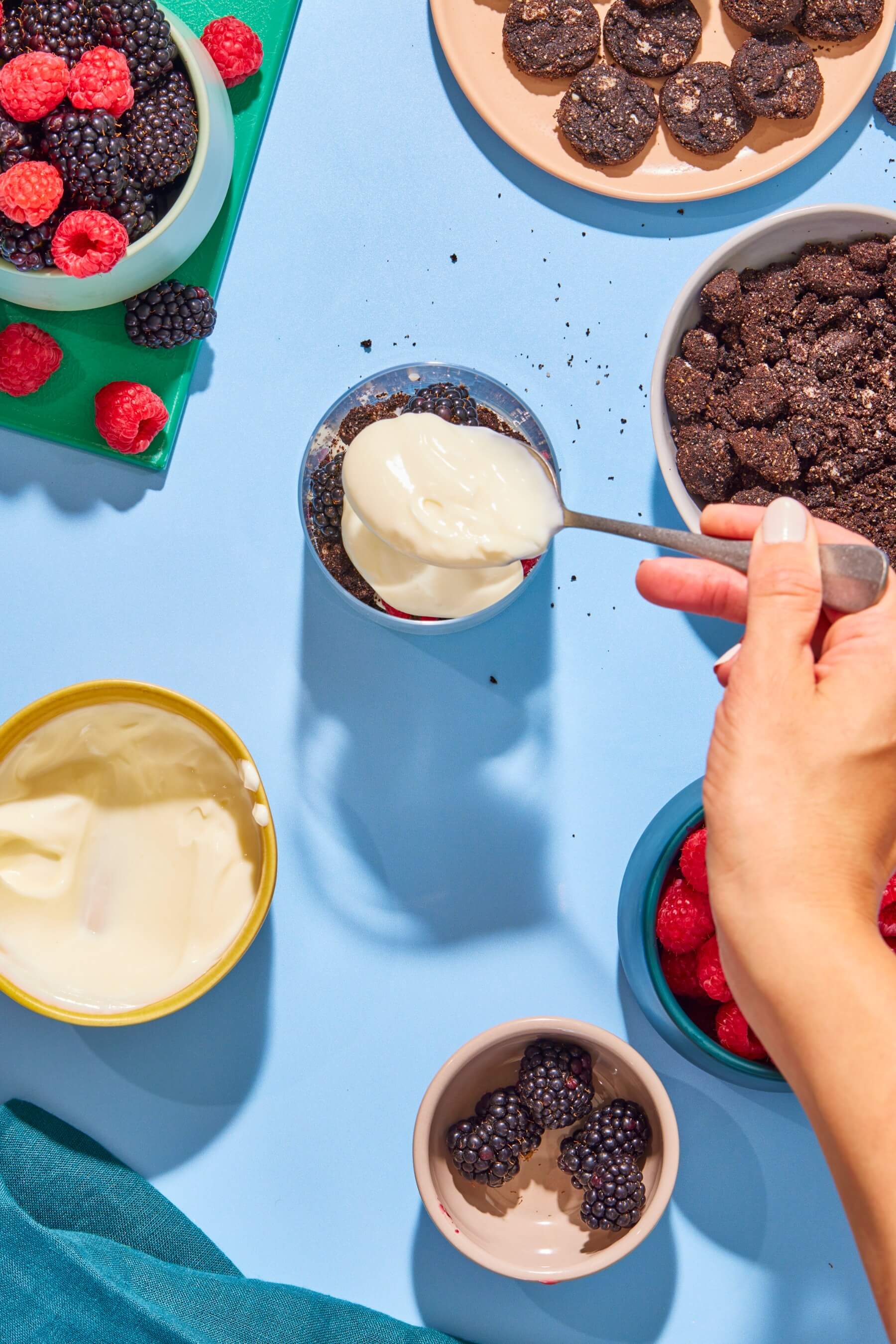 - Fill the bottoms of four glasses with a ¼ cup of lemon yogurt, then alternate filling the cups with about a ¼ cup each of fruit, Myna cookie crumbles, and more yogurt.