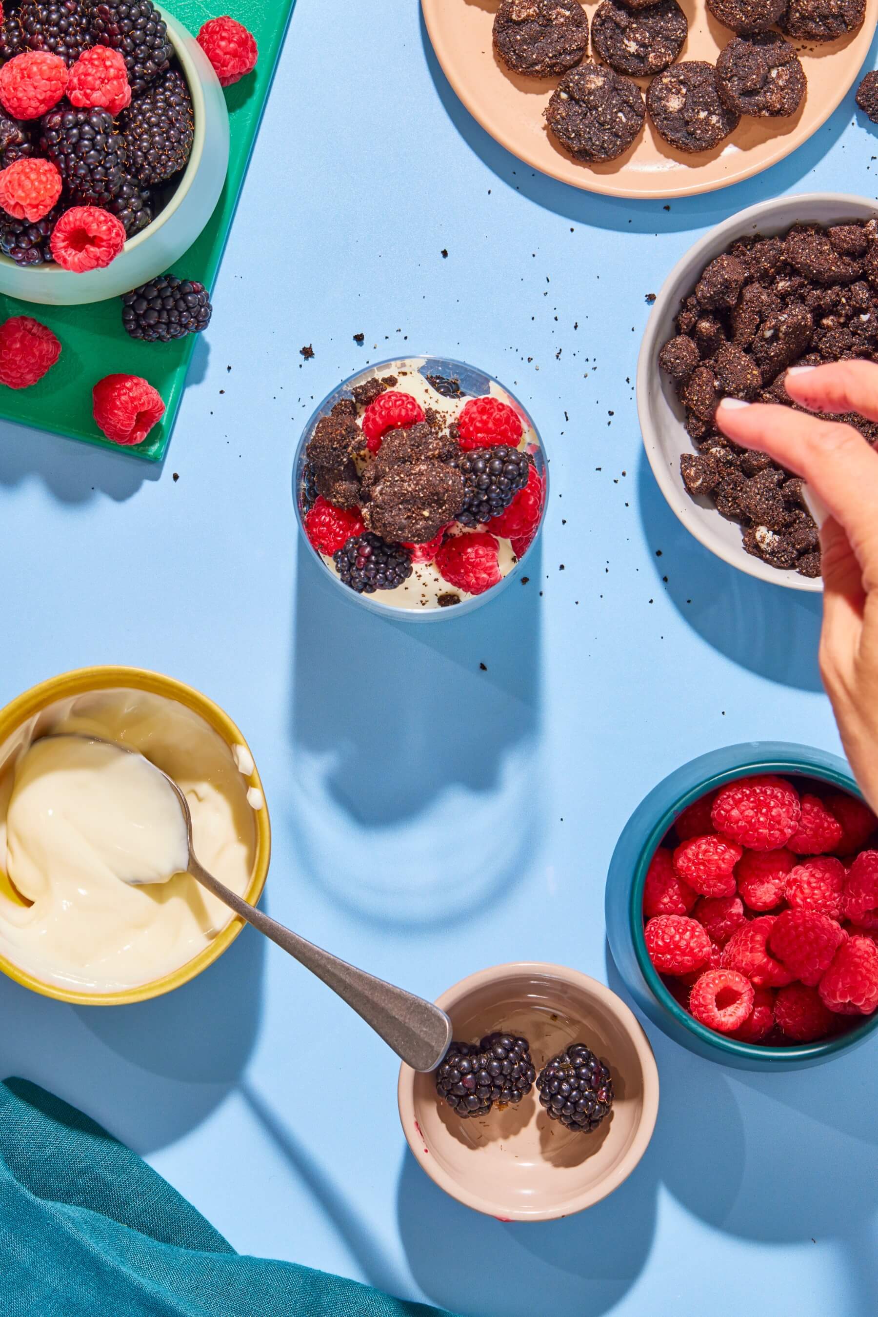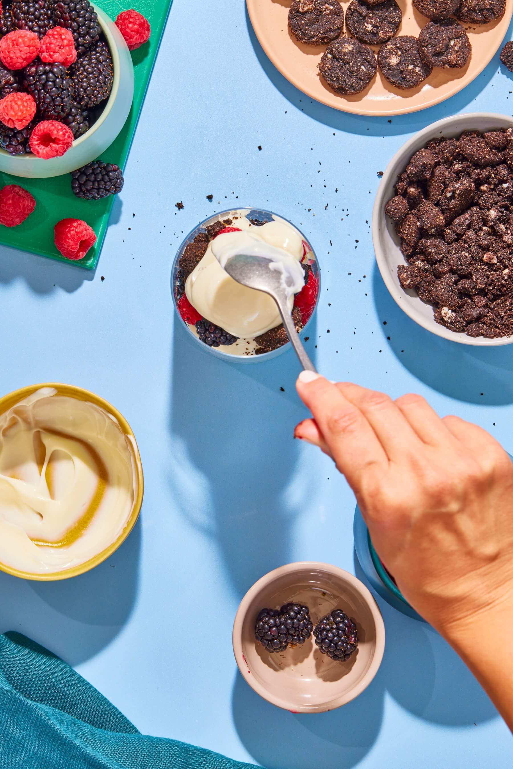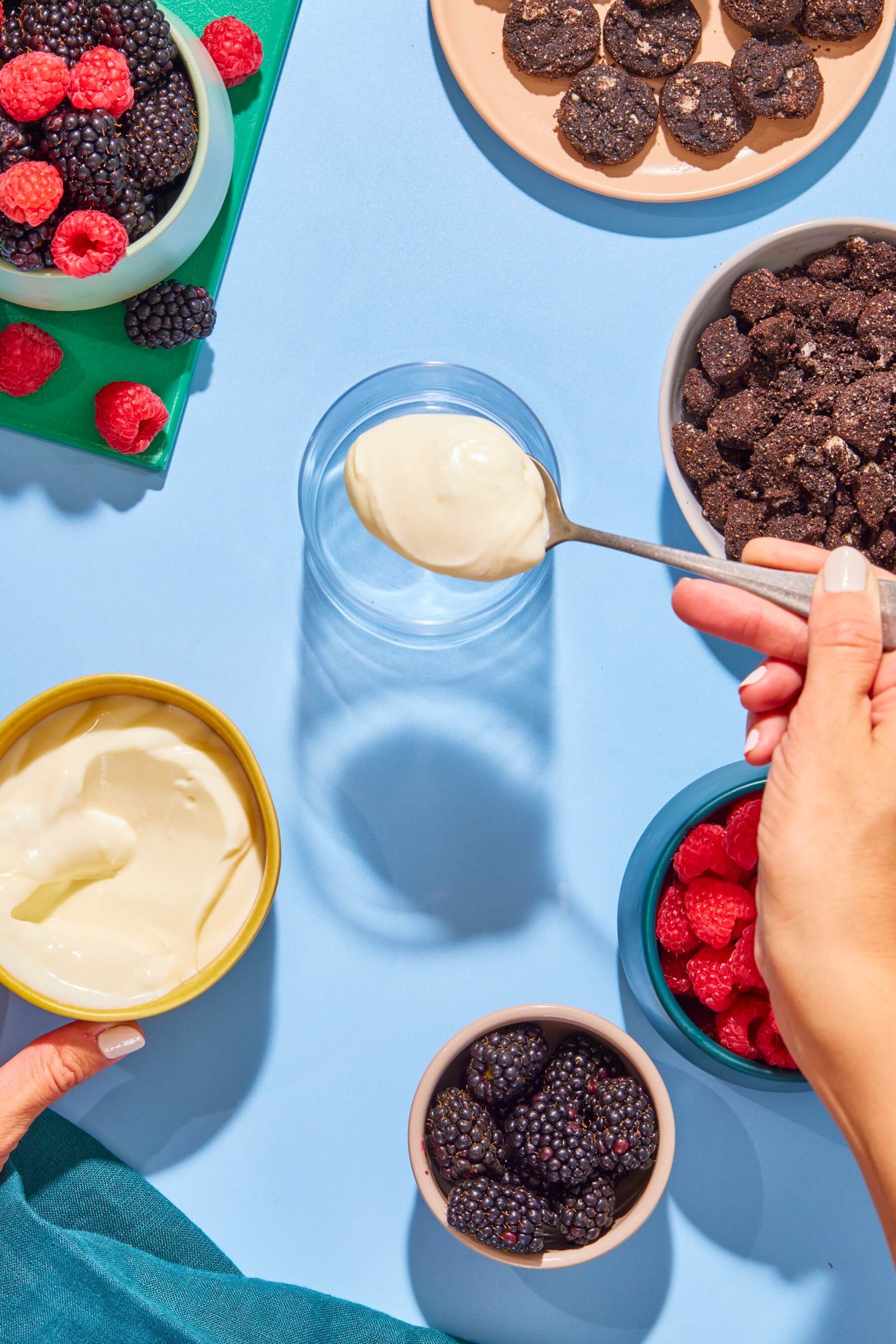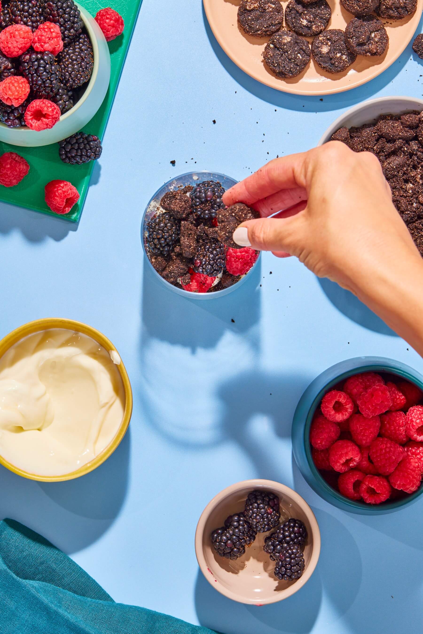 - Fill the bottoms of four glasses with a ¼ cup of lemon yogurt, then alternate filling the cups with about a ¼ cup each of fruit, Myna cookie crumbles, and more yogurt.